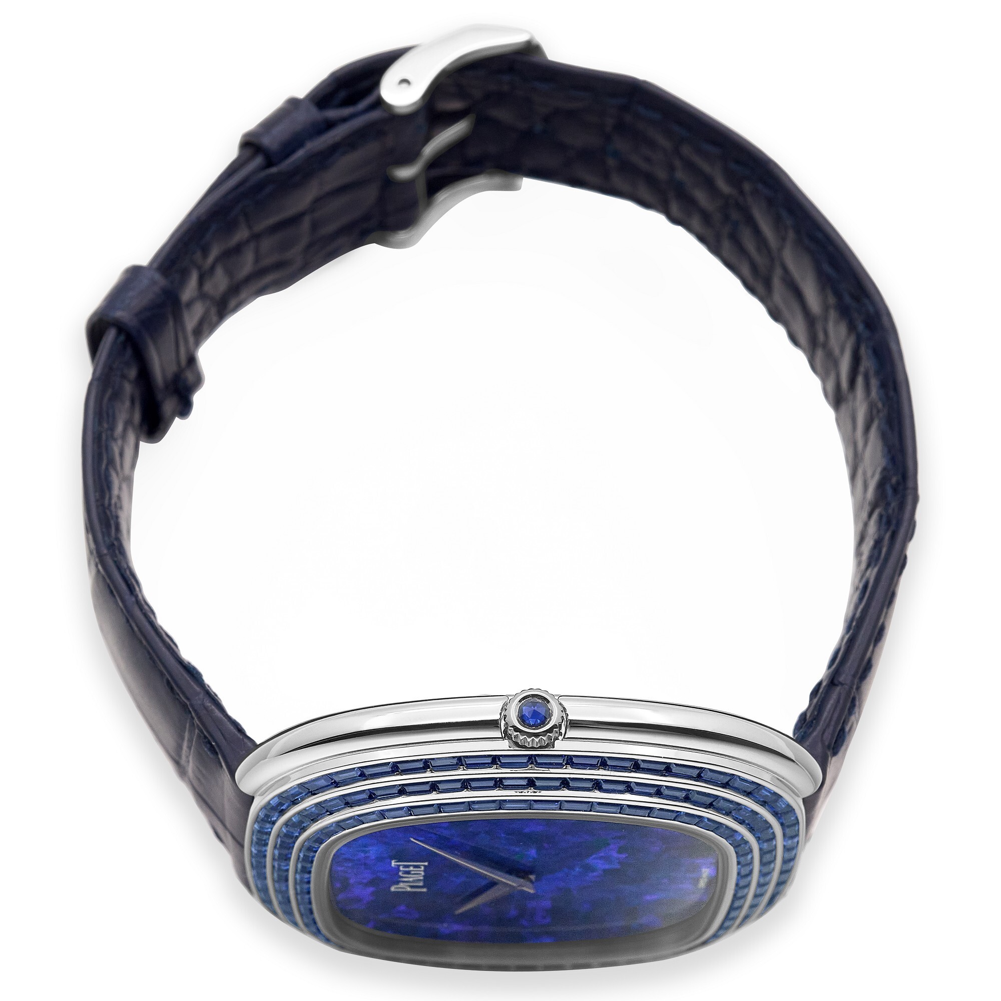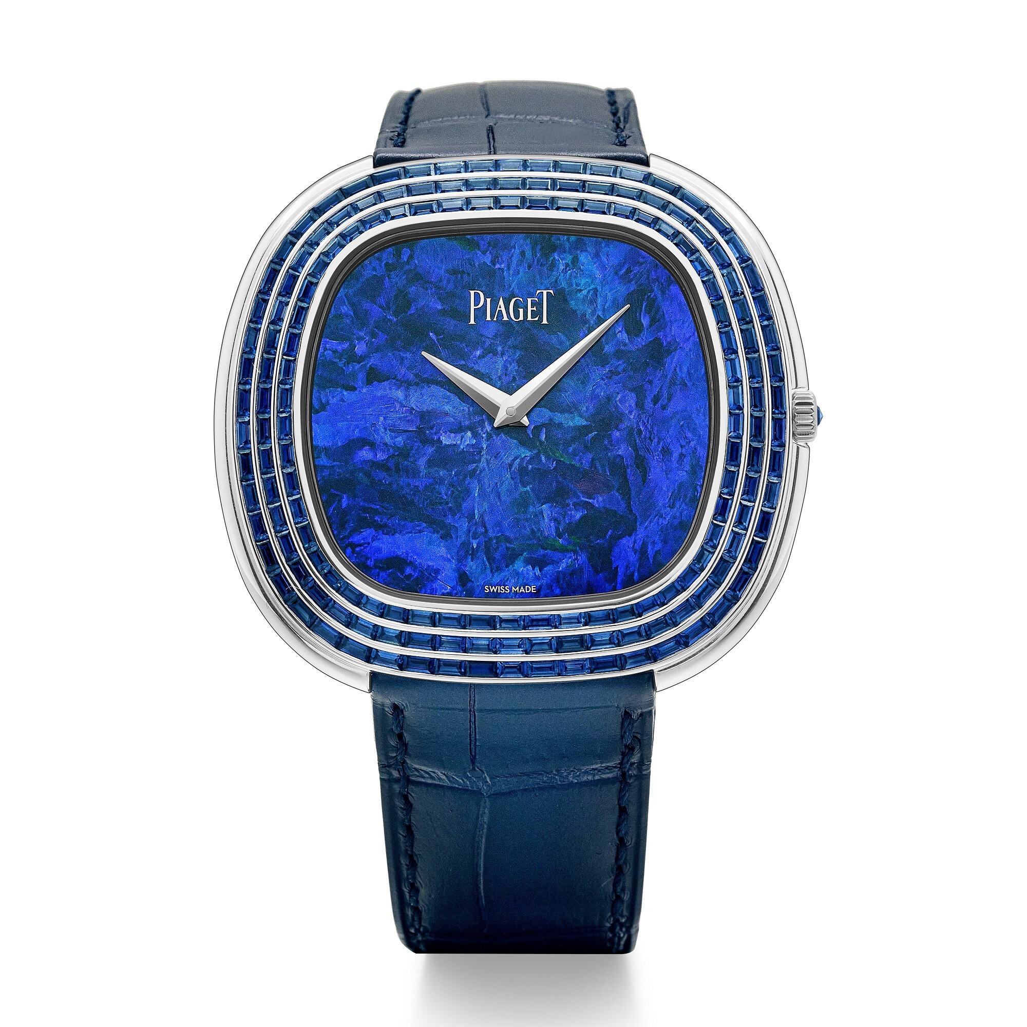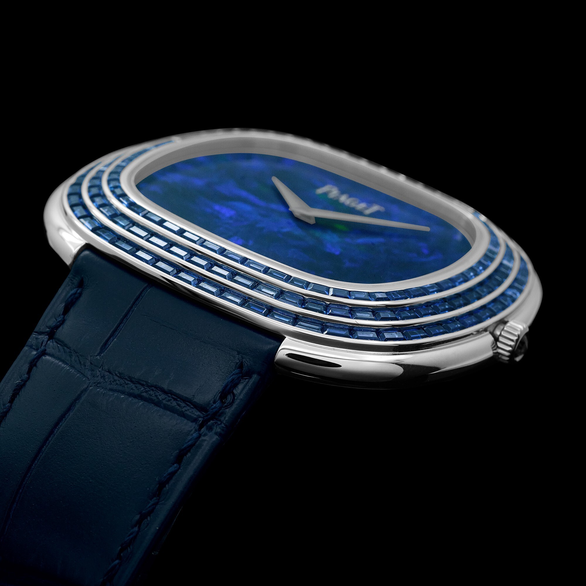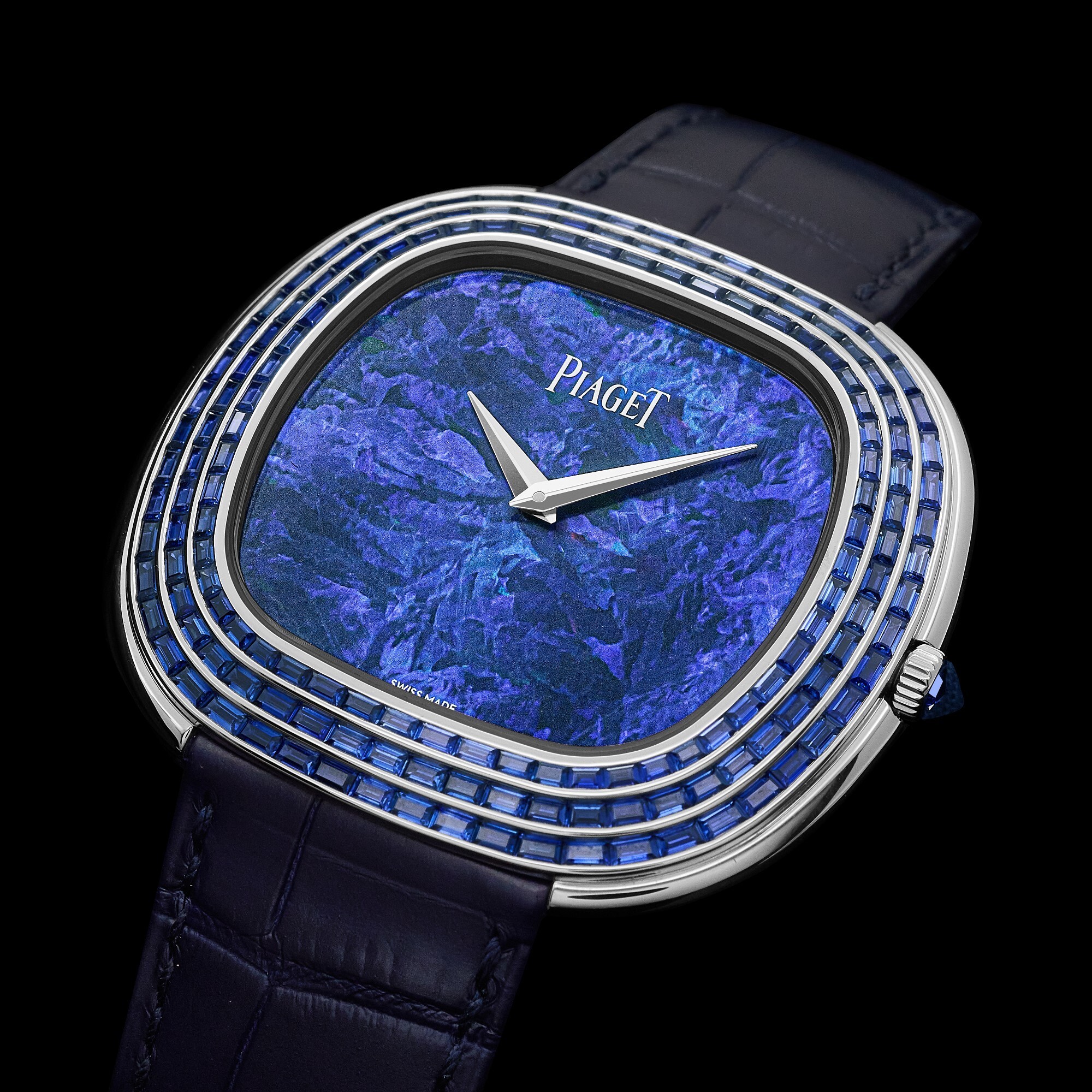 表盘使用欧泊切片制作,宝石天然形成的蓝绿纹理与蓝色蓝宝石表圈交相辉映,绽放出深邃而迷人的绚丽光彩。双针布局表盘搭配太妃形指针和「PIAGET」铭文,凸显利息先锋的气质。