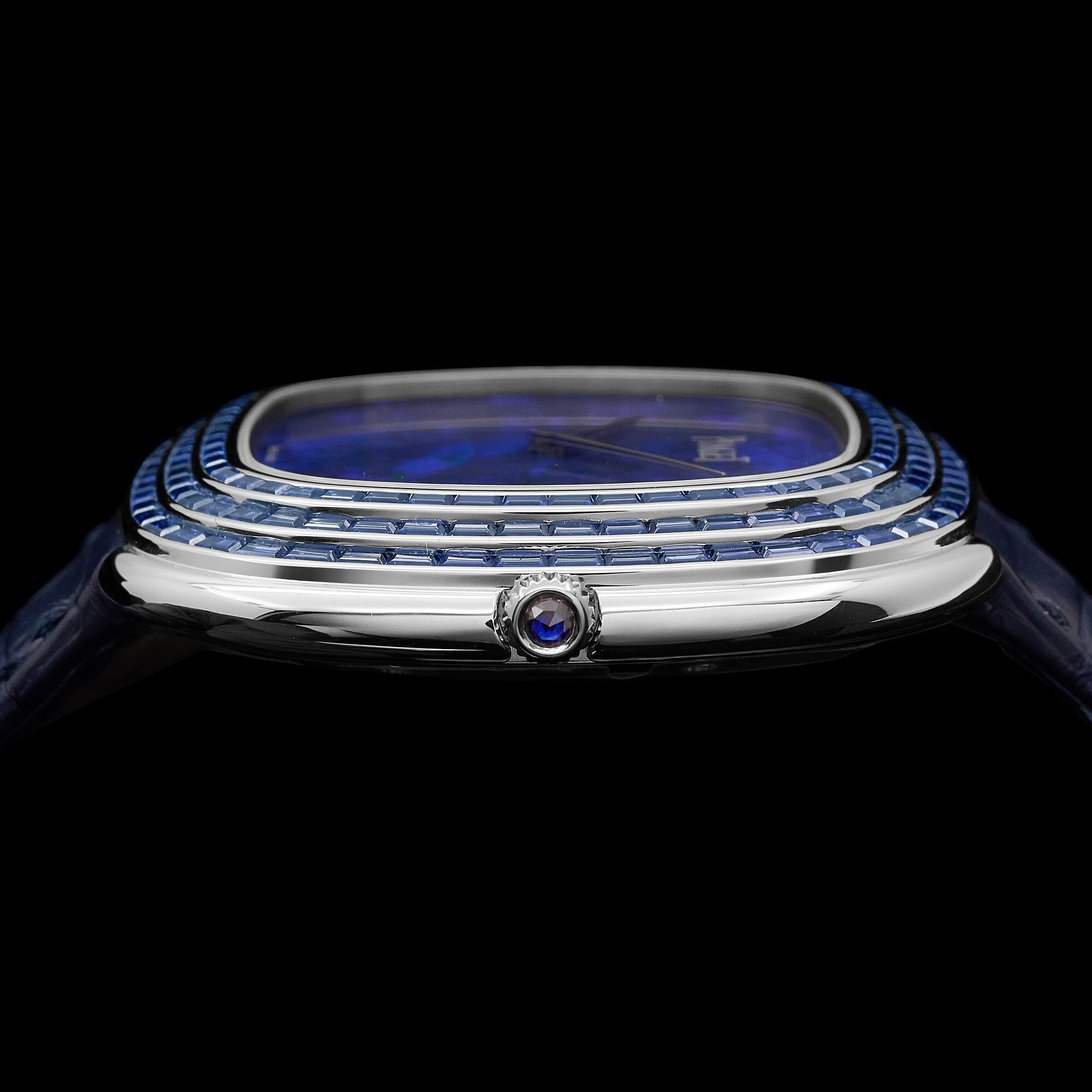 45mm白金表壳延续 Black Tie 圆润枕形造型,令人联想起1970年代的复古电视机。表壳外侧采用垂直拉丝抛光,圆模雕刻装饰表圈镶嵌三排枕形切割蓝色蓝宝石,精巧的表冠顶端亦镶嵌一颗多切面蓝色蓝宝石。