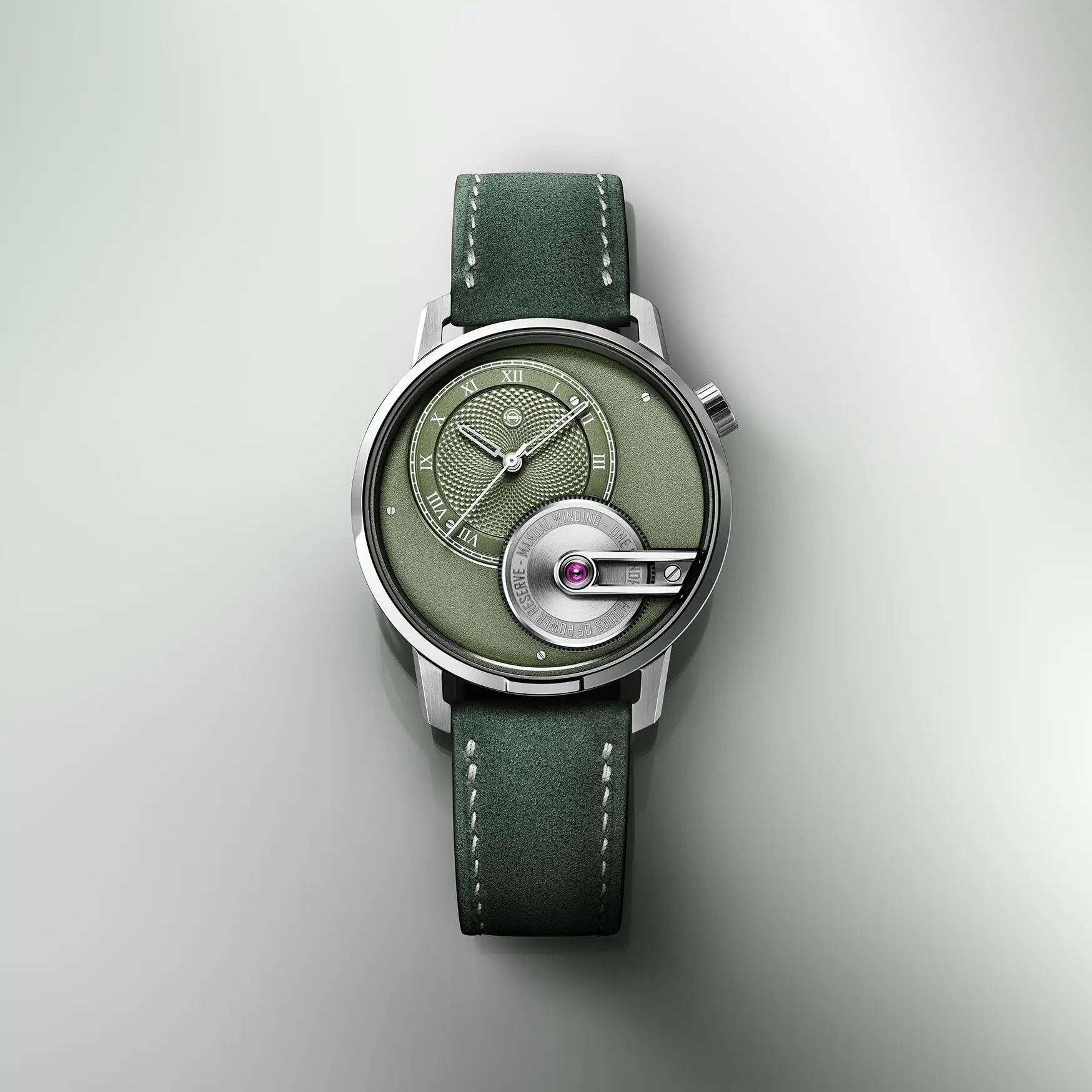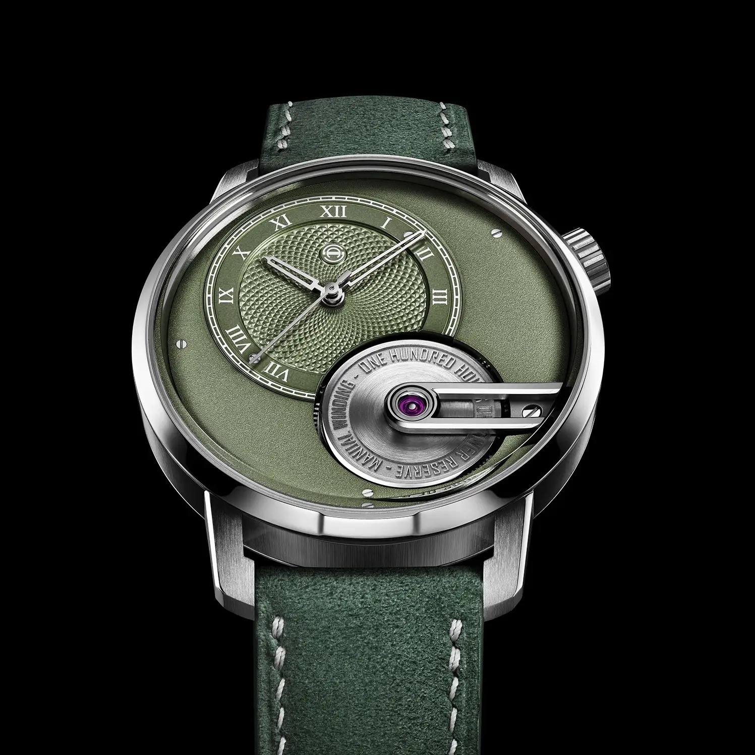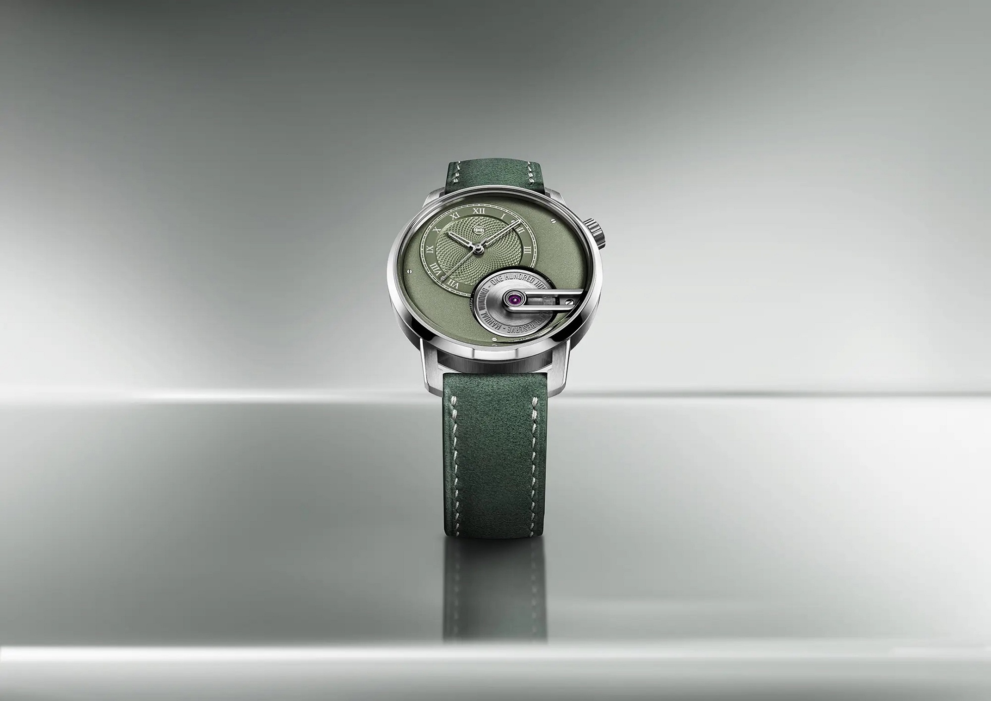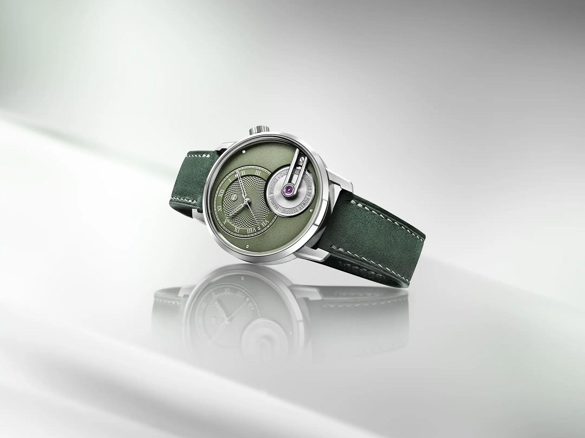 森林绿色表盘采用偏心式布局,主表盘为磨砂饰纹,11点时分盘装饰手工玑镂的麦粒纹,搭配镂空时分针;5点银色发条盒采用环形拉丝和磨砂纹,并刻有「One Hundred Hours of Power Reserve」铭文。