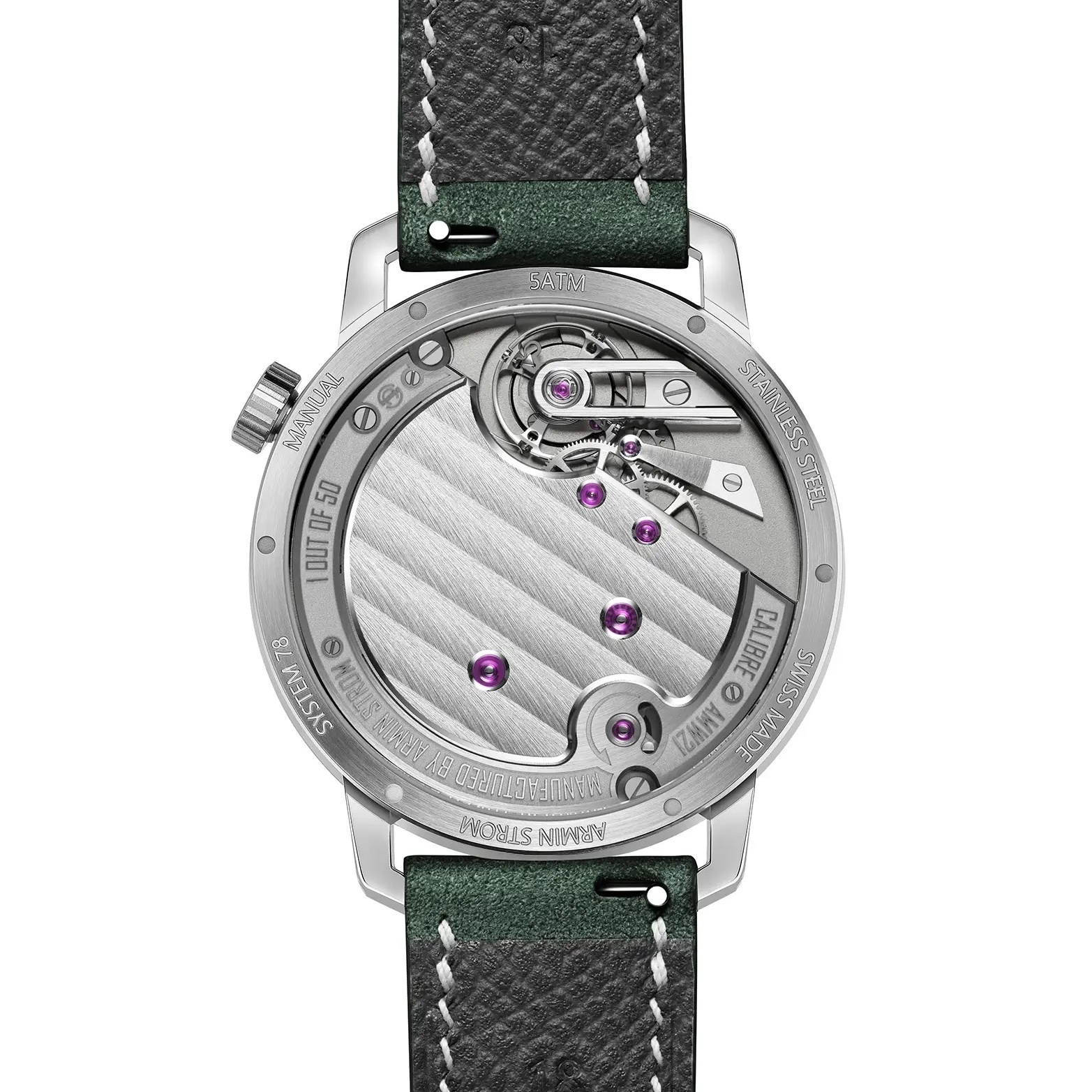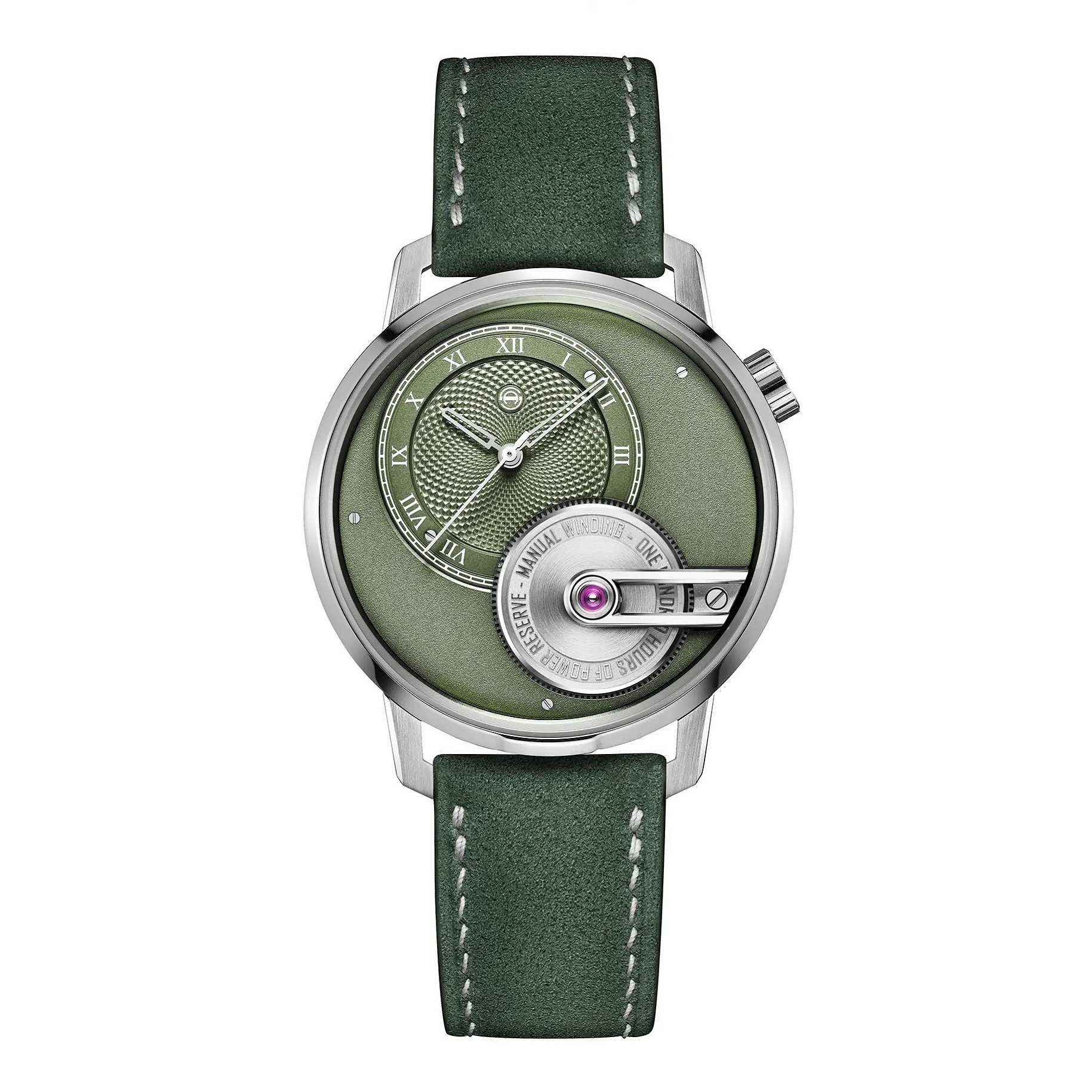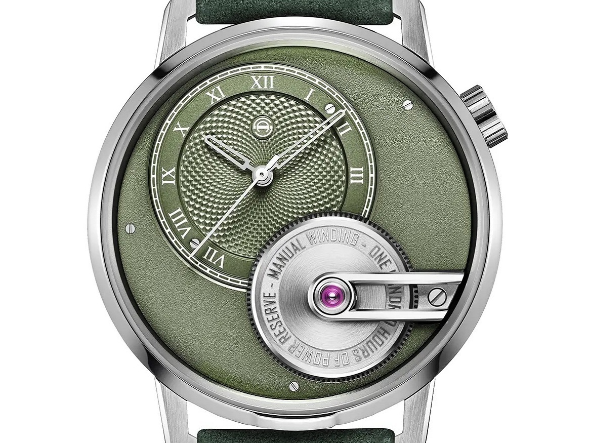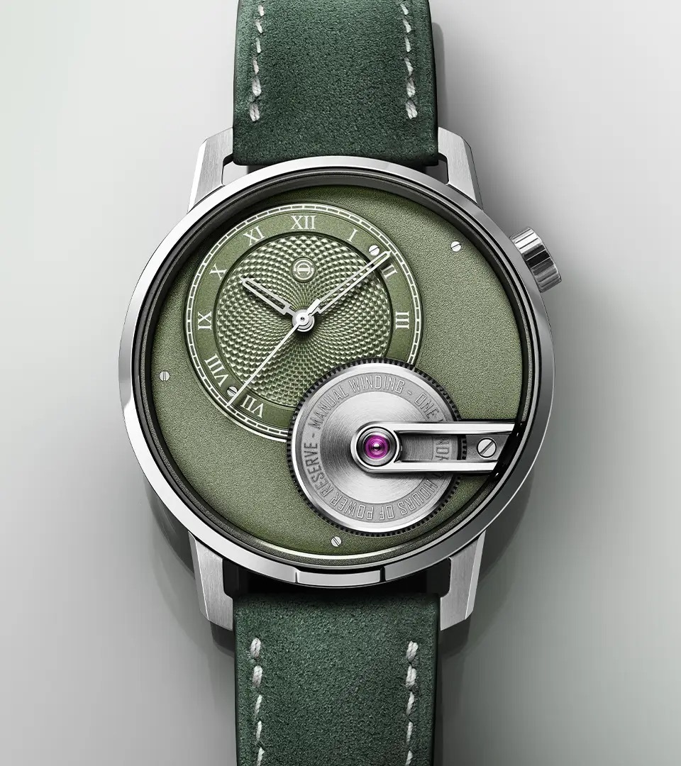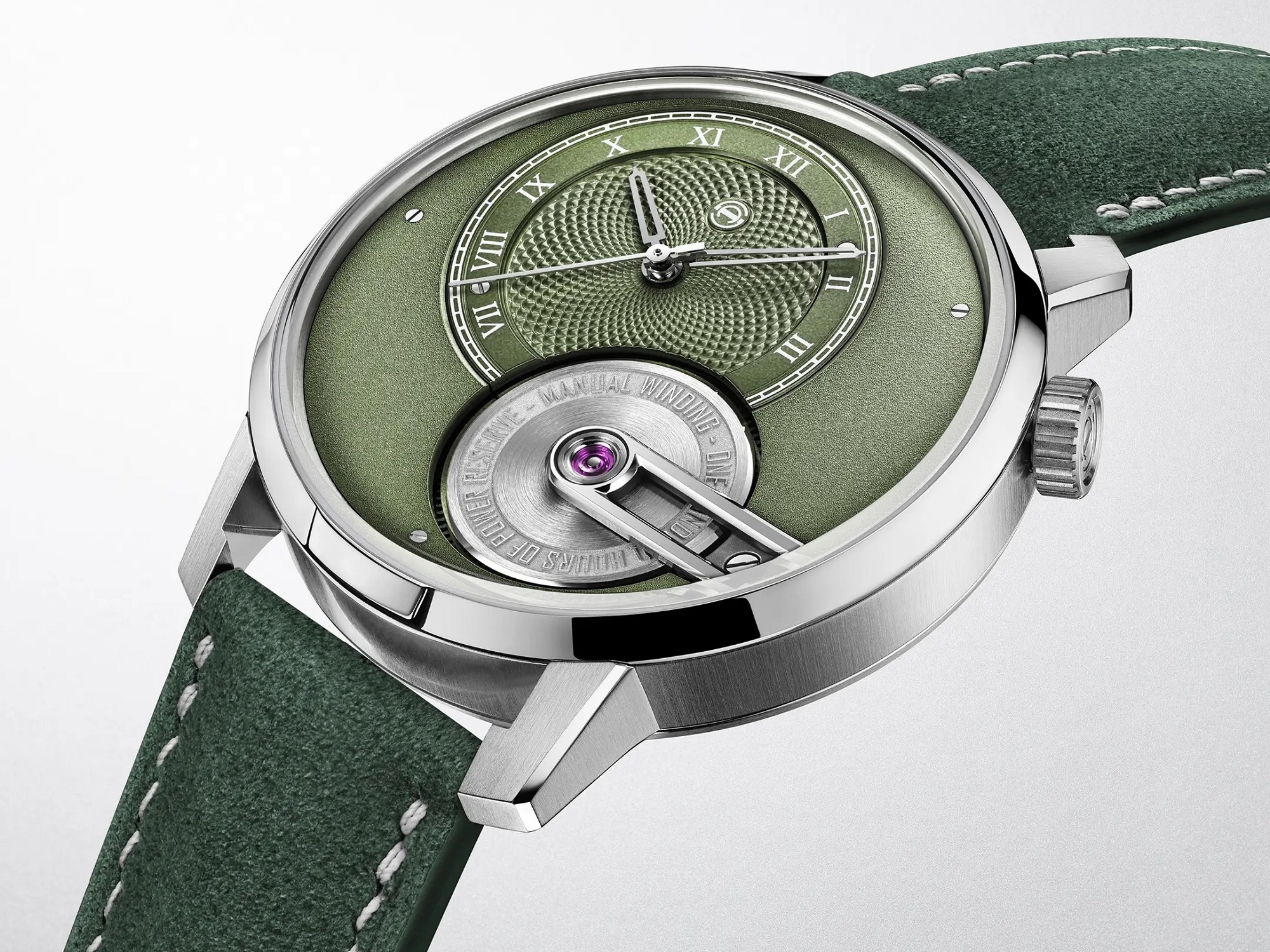 森林绿色表盘采用偏心式布局,主表盘为磨砂饰纹,11点时分盘装饰手工玑镂的麦粒纹,搭配镂空时分针;5点银色发条盒采用环形拉丝和磨砂纹,并刻有「One Hundred Hours of Power Reserve」铭文。