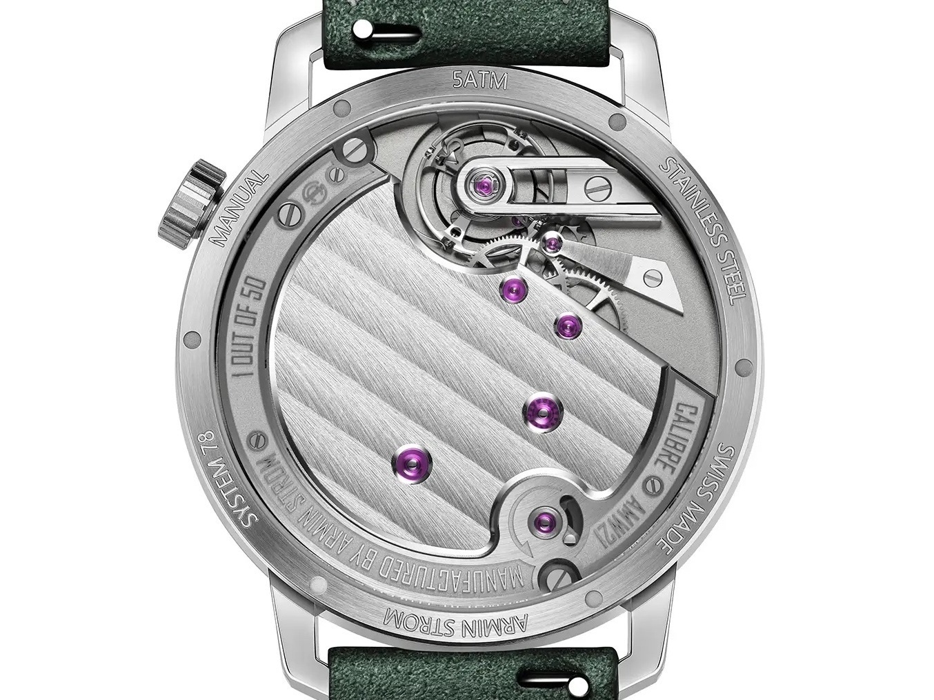 38mm精钢表壳厚度仅9.38mm,是 Armin Strom 迄今最纤薄的腕表作品,十分 dressy 易戴,拉丝抛光润饰凸显纤细表圈和硬朗表耳的线条感。表壳侧面2点采用大尺寸棱纹表冠。