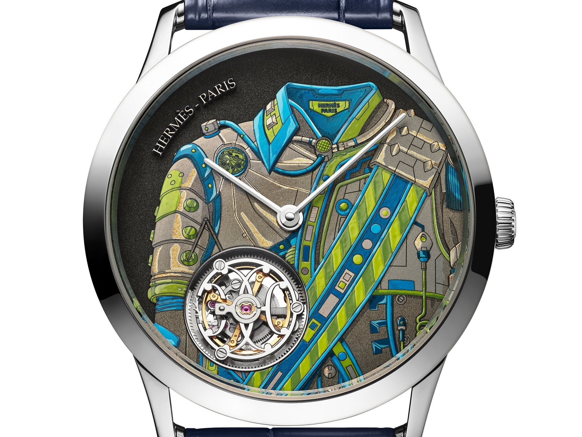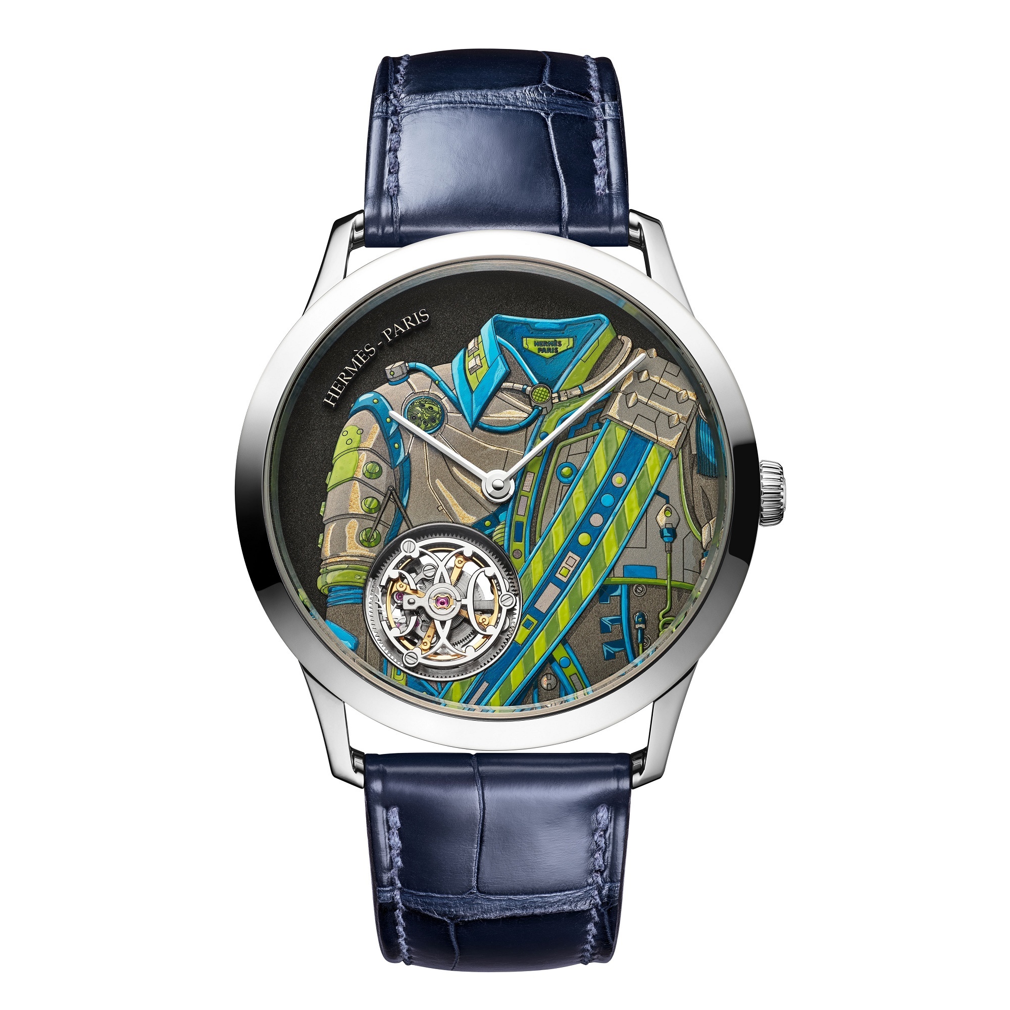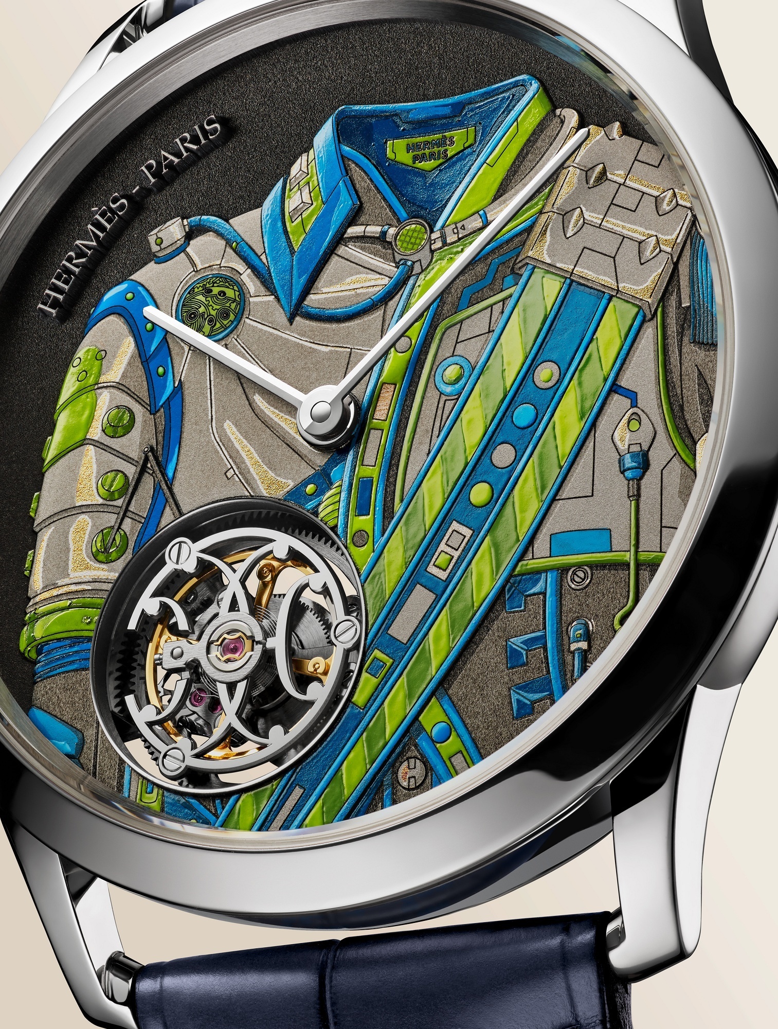 表盘7点为醒目的飞行陀飞轮结构,陀飞轮框架装饰两个「H」字交织而成的 Lift 符号——这一符号源自巴黎福宝大道24号爱马仕传奇历史总店的电梯装饰,亦如同制服上的一件机械装置。