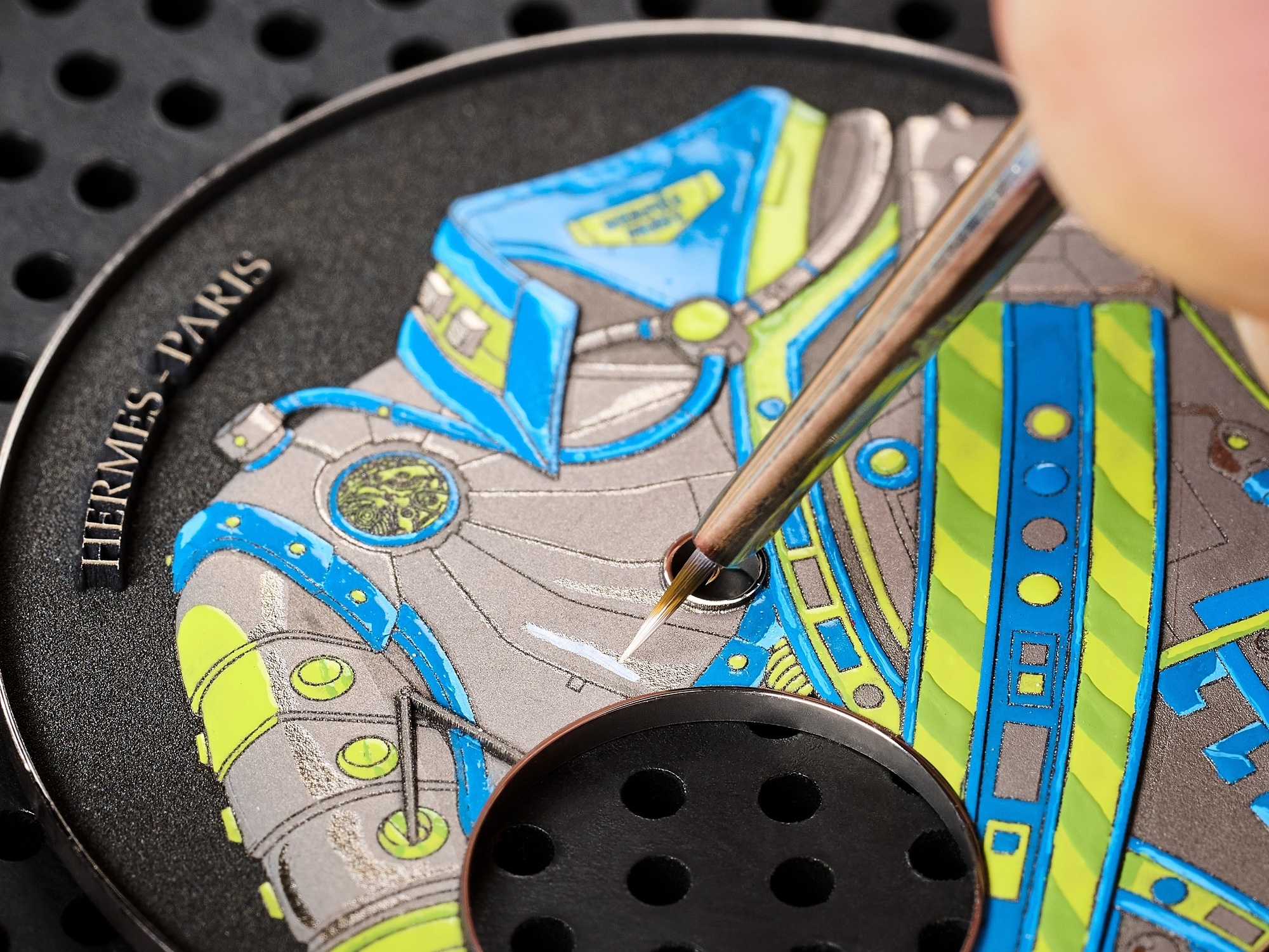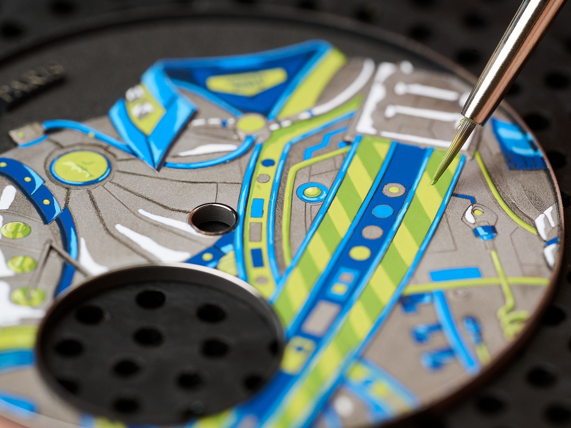工匠首先在表盘基座上雕刻出图案轮廓与结构,然后以彩漆微绘工艺涂覆细节层次,经过多次烘干和上色,最终获得充满立体感的华丽画面。制服图案共有两个版本,一款为融合黄色、红色和亮蓝色的暖色调,另一款为灰色、紫色和棕色的冷色调。