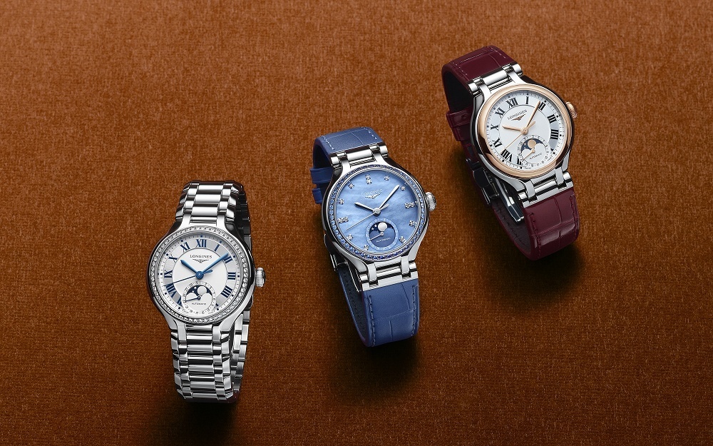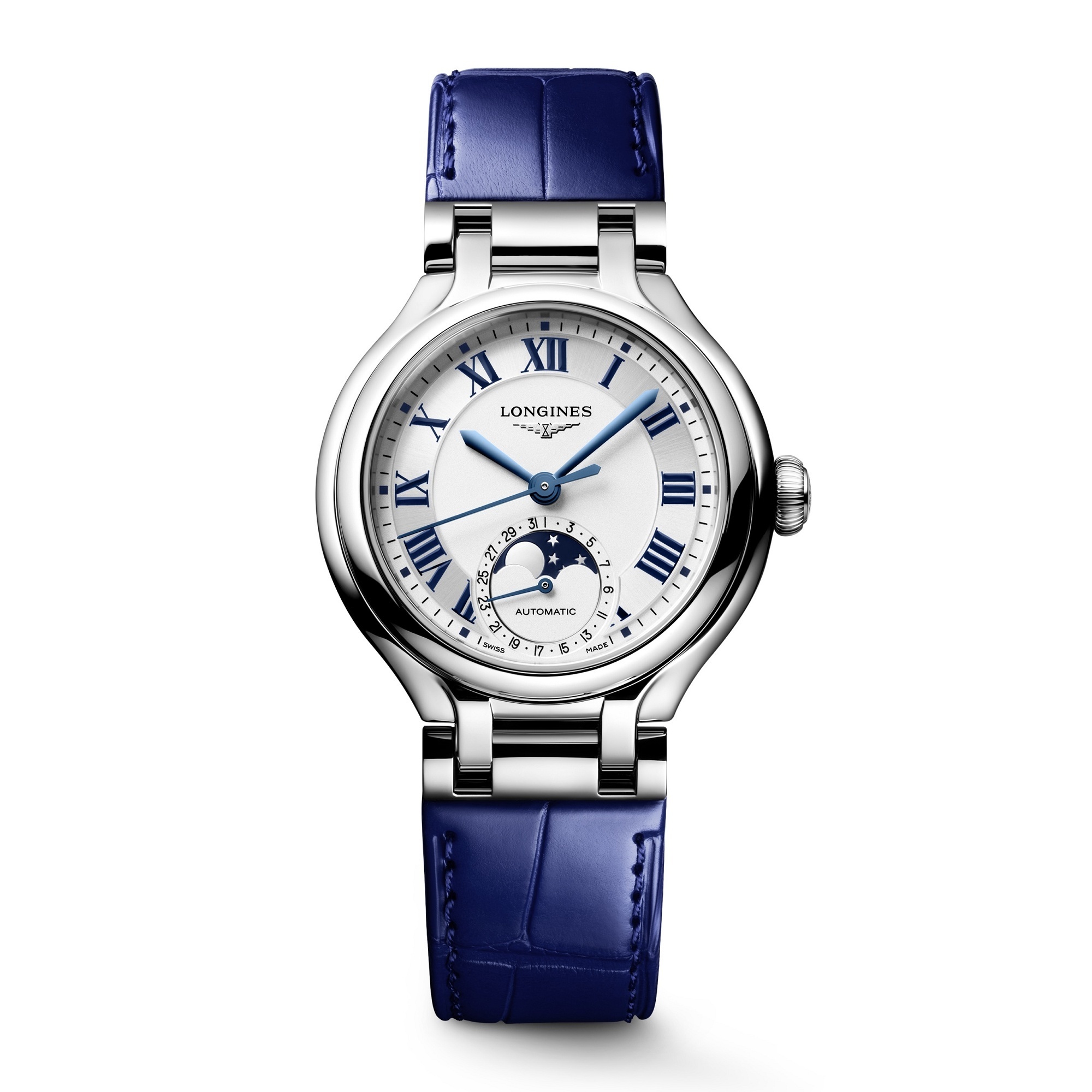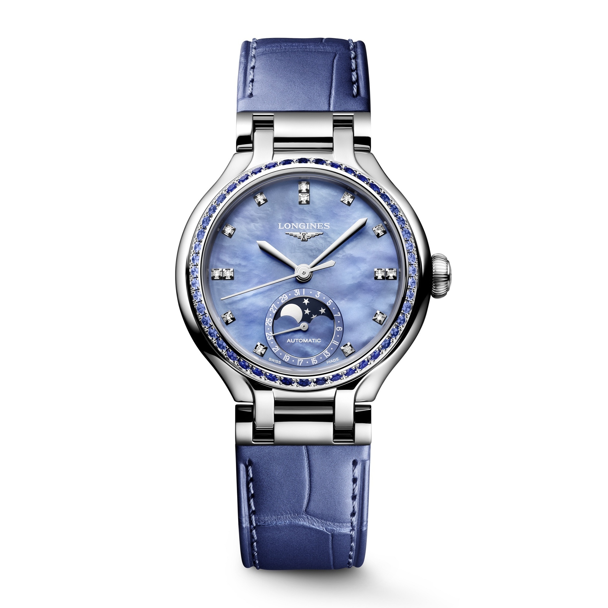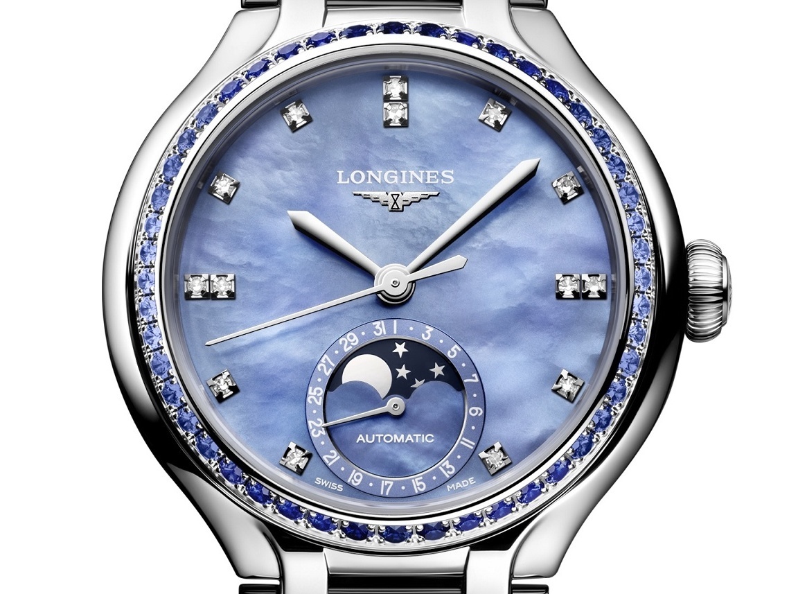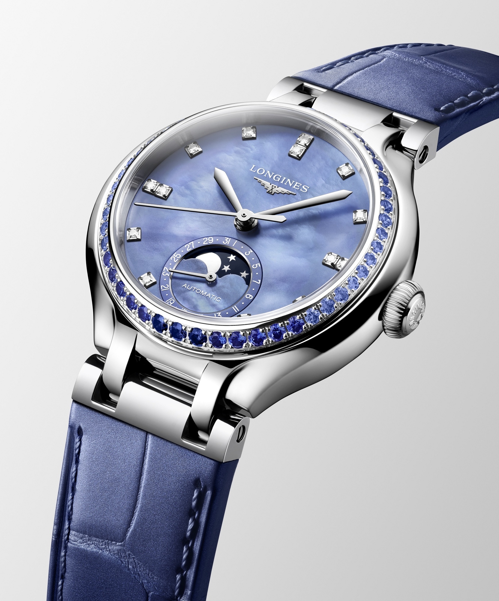 表盘亦提供蓝色珍珠母贝、白色珍珠母贝和银色三种选择——蓝色母贝款表圈镶嵌48颗蓝宝石,与表盘微妙渐变的天幕蓝色调交相辉映,气质尤为优雅迷人;白色母贝表盘点缀14颗钻石时标;银色表盘装饰经典日晖纹,搭配复古的罗马数字时标和轨道式分钟刻度风格经典而醒目。月相日期盘位于表盘6点,通过一枚小巧的蓝钢指针指向日期。