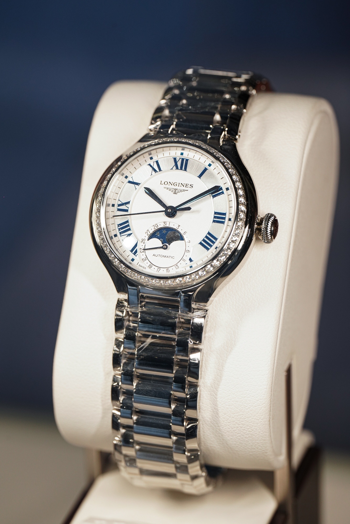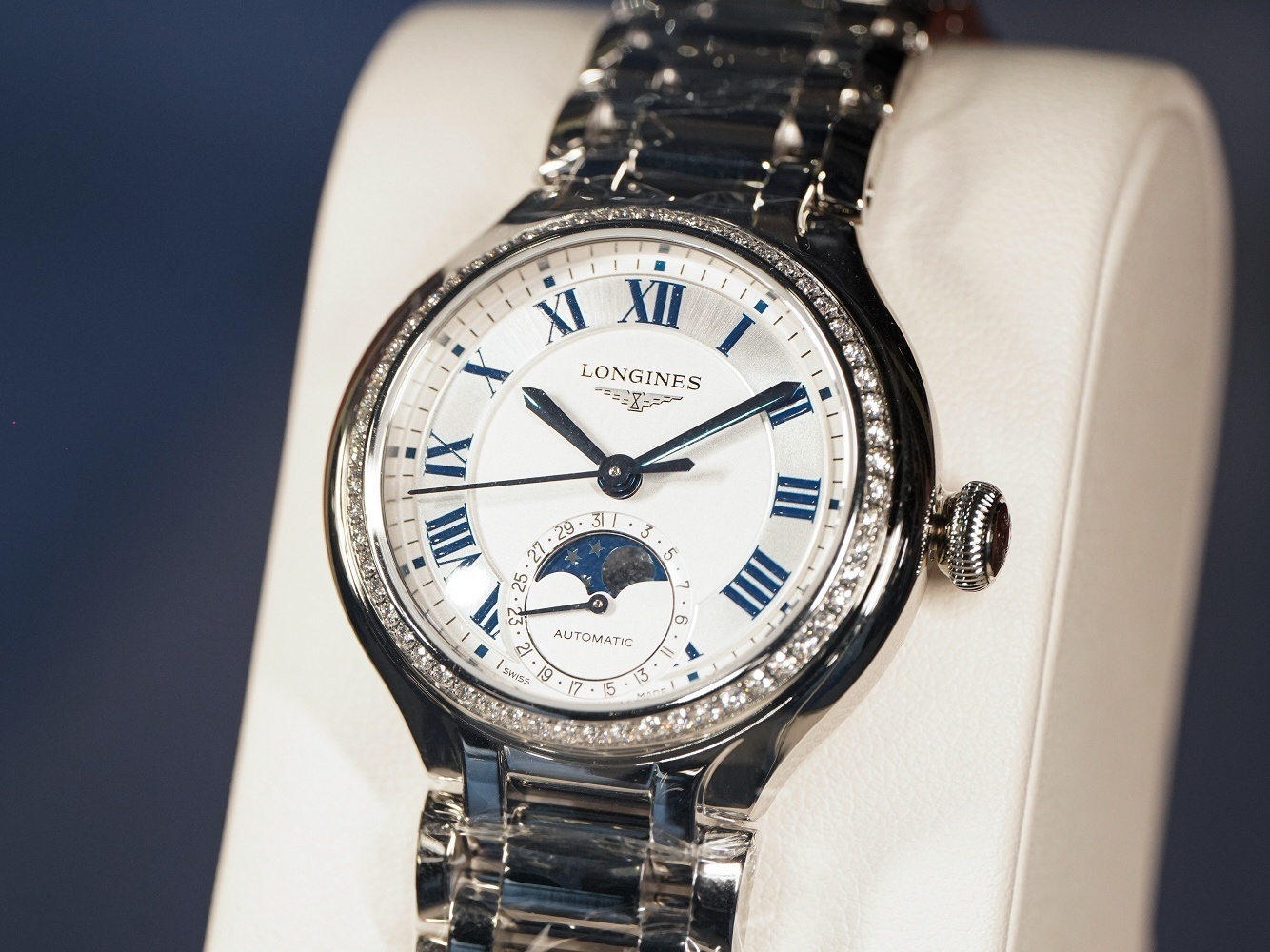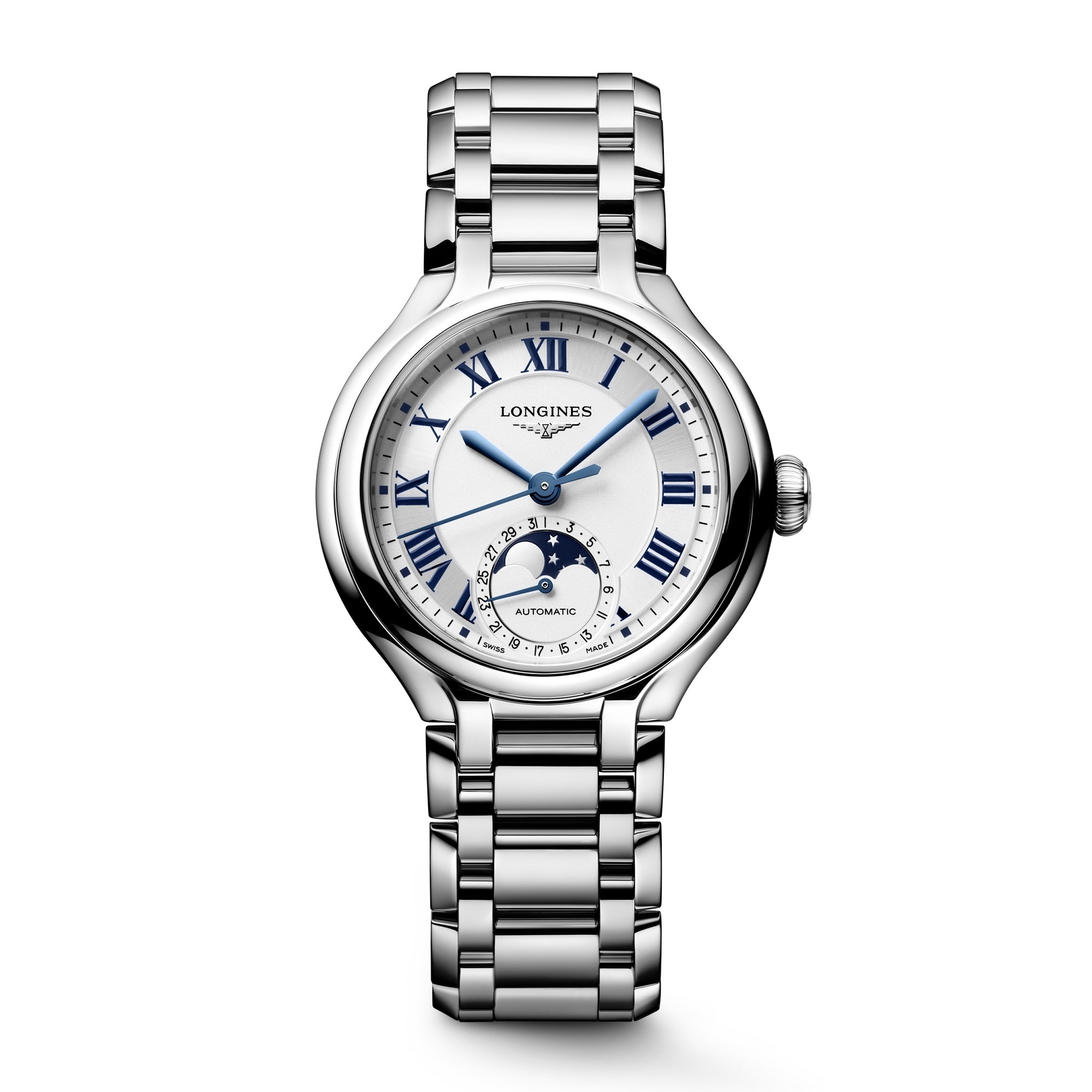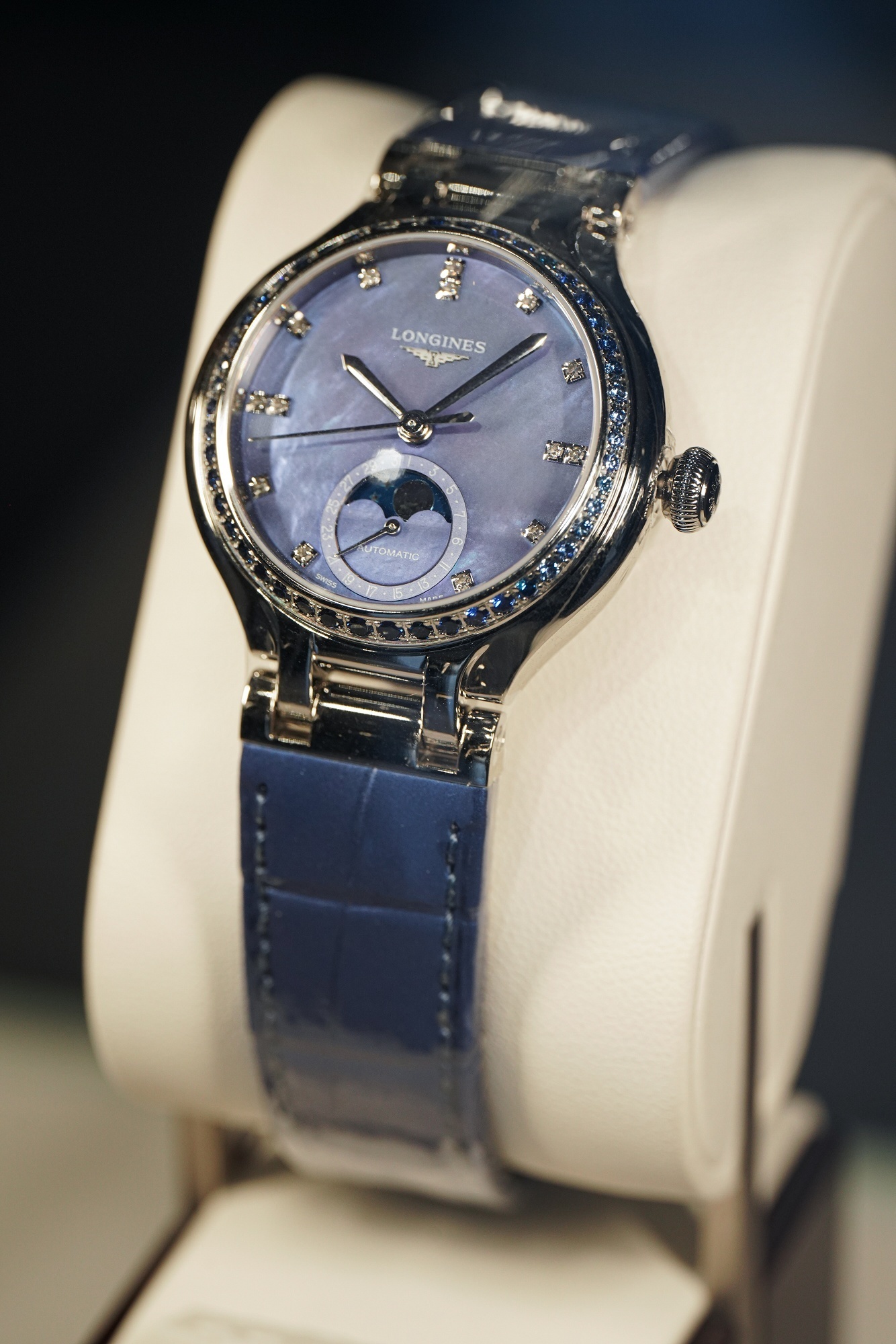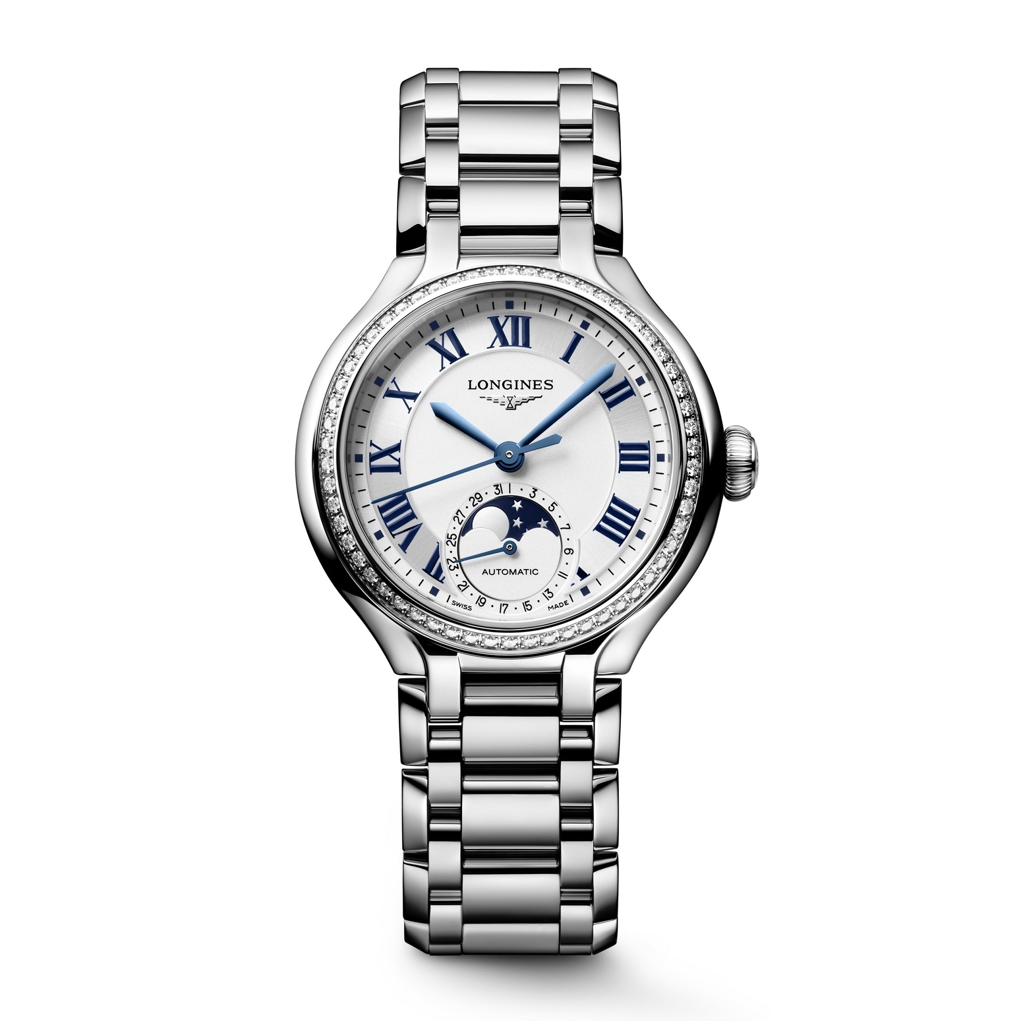 表盘亦提供蓝色珍珠母贝、白色珍珠母贝和银色三种选择——蓝色母贝款表圈镶嵌48颗蓝宝石,与表盘微妙渐变的天幕蓝色调交相辉映,气质尤为优雅迷人;白色母贝表盘点缀14颗钻石时标;银色表盘装饰经典日晖纹,搭配复古的罗马数字时标和轨道式分钟刻度风格经典而醒目。月相日期盘位于表盘6点,通过一枚小巧的蓝钢指针指向日期。